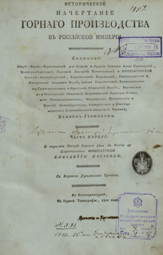 Герман, Иван Филиппович (1755-1815). Историческое начертание горного производства в Российской империи : с картою Уральского хребта. Ч. 1 : О первом начале горного дела в России до царствования императрицы Елизаветы Петровны / соч. обер-берг-гауптманом 4-го класса и ордена Святыя Анны кавалером, Екатеринбургских горных заводов начальником... Иваном Германом. - Екатеринбург : Горн. тип., 1810