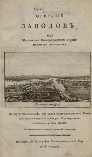 Герман, Иван Филиппович (1755-1815). Описание заводов под ведомством Екатеринбургского горного начальства состоявших : в двух отделениях, из коих первое заключает Екатеринбургские казенные, а второе партикулярные Уральского хребта заводы. - [Екатеринбург] : Тип. Екатеринбургских горных заводов, [1808]
