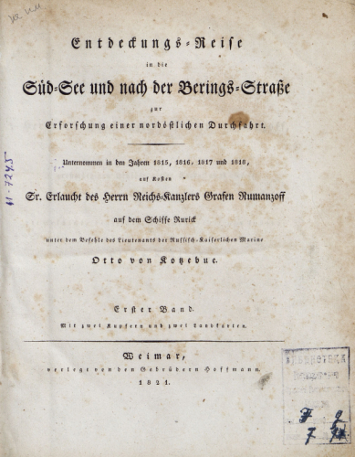 Entdeckungs- Reise in die Süd- See und nach der Berings- Strasse zur Erforschung einer nordöstlichen Durchfahrt : unternommen in den Jahren 1815, 1816, 1817 und 1818, auf Kosten Sr. Erlaucht des Herrn Reichs- Kanzlers Grafen Rumanzoff auf dem Schiff Rurick
