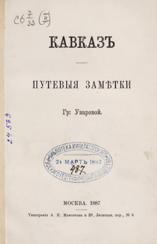 Уварова, Прасковья Сергеевна (1840-1924). Кавказ : путевые заметки / [соч.] Гр. Уваровой. - Москва : Тип. А.И. Мамонтова и Ко, 1887