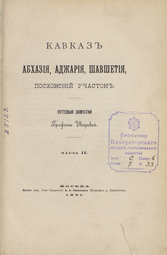 Уварова, Прасковья Сергеевна (1840-1924). Кавказ : путевые заметки Ч. 2 : Абхазия, Аджария, Шавшетия, посховский участок / [соч.] Гр. Уваровой. - Москва : Т-во скоропеч. А.А. Левенсон, 1891