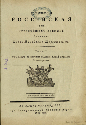 Щербатов, Михаил Михайлович (1733-1790). История Российская от древнейших времен. Т. 1 : От начала до кончины великого князя Ярослава Владимировича / соч. князь Михайлом Щербатовым - вторым тиснением. - Санкт-Петербург : при Имп. Акад. наук, 1794