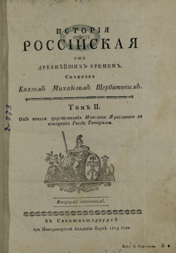 Щербатов, Михаил Михайлович (1733-1790). История Российская от древнейших времен. Т. 2 : От начала царствования Изяслава Ярославича до покорения России татарами / соч. князь Михайлом Щербатовым. - вторым тиснением. - Санкт-Петербург : при Имп. Акад. наук, 1805