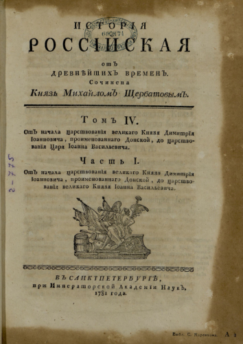 Щербатов, Михаил Михайлович (1733-1790). История Российская от древнейших времен. Т. 4 : От начала царствования великого князя Димитрия Иоанновича, проименованного Донской, до царствования царя Иоанна Васильевича, Ч. 1 : От начала царствования великого князя Димитрия Иоанновича, проименованного Донской, до царствования великого князя Иоанна Васильевича / соч. князь Михайлом Щербатовым - Санкт-Петербург : при Имп. Акад. наук, 1781