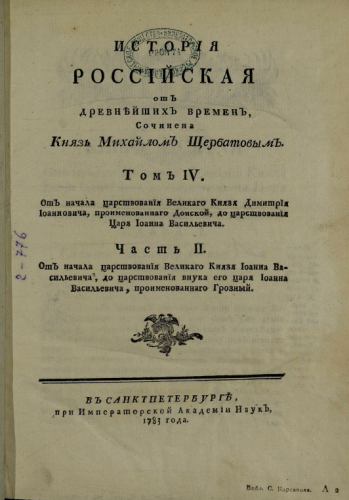 Щербатов, Михаил Михайлович (1733-1790). История Российская от древнейших времен. Т. 4 : От начала царствования великого князя Димитрия Иоанновича, проименованного Донской, до царствования царя Иоанна Васильевича, Ч. 2 : От начала царствования великого князя Иоанна Васильевича, до царствования внука его царя Иоанна Васильевича, проименованного Грозный / соч. князь Михайлом Щербатовым - Санкт-Петербург : при Имп. Акад. наук, 1783