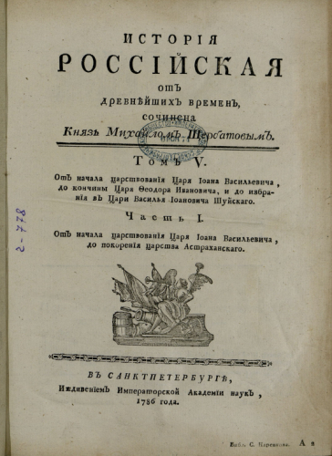 Щербатов, Михаил Михайлович (1733-1790). История Российская от древнейших времен. Т. 5 : От начала царствования царя Иоанна Васильевича до кончины царя Федора Иоанновича, Ч. 1 : От начала царствования царя Иоанна Васильевича до покорения Царства Астраханского / соч. князь Михайлом Щербатовым - Санкт-Петербург : иждивением Имп. Акад. наук, 1786
