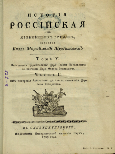 Щербатов, Михаил Михайлович (1733-1790). История Российская от древнейших времен. Т. 5 : От начала царствования царя Иоанна Васильевича до кончины царя Федора Иоанновича, Ч. 2 : От покорения Астрахани до начала завоевания Царства Сибирского / соч. князь Михайлом Щербатовым - Санкт-Петербург : иждивением Имп. Акад. наук, 1789