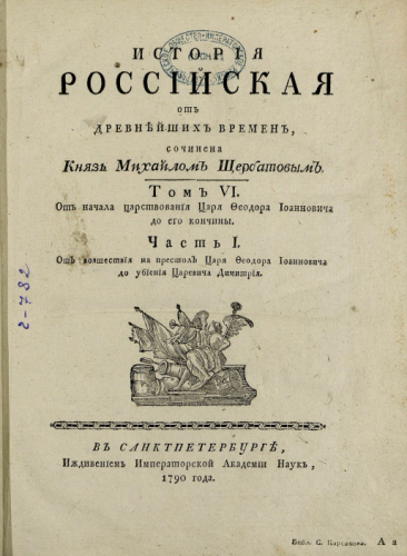 Щербатов, Михаил Михайлович (1733-1790). История Российская от древнейших времен. Т. 6 : От начала царствования царя Федора Иоанновича до его кончины, Ч. 1 : От восшествия на престол царя Феодора Иоанновича до убиения царевича Димитрия / соч. князь Михайлом Щербатовым - Санкт-Петербург : иждивением Имп. Акад. наук, 1790
