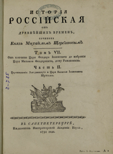 Щербатов, Михаил Михайлович (1733-1790). История Российская от древнейших времен. Т. 7 : От кончины царя Феодора Иоанновича до избрания царя Михаила Федоровича, дому Романовых, Ч. 2 : Царствование Лжедимитрия и царя Василья Иоанновича Шуйского / соч. князь Михайлом Щербатовым - Санкт-Петербург : иждивением Имп. Акад. наук, 1791