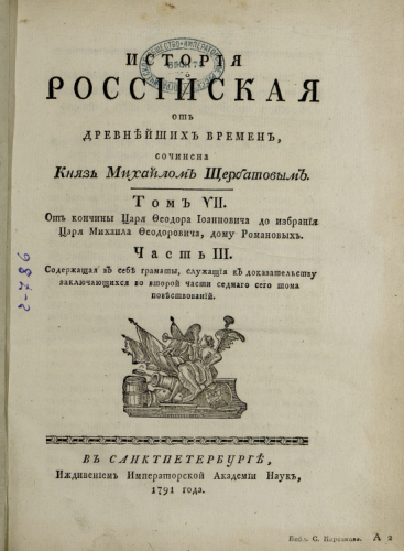 Щербатов, Михаил Михайлович (1733-1790). История Российская от древнейших времен. Т. 7 : От кончины царя Феодора Иоанновича до избрания царя Михаила Федоровича, дому Романовых, Ч. 3 : Содержащая в себе грамоты, служащие к доказательству заключающихся во второй части седьмого сего тома повествований / / соч. князь Михайлом Щербатовым - Санкт-Петербург : иждивением Имп. Акад. наук, 1791