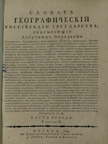 Словарь географический Российского государства, описывающий азбучным порядком географически, топографически, гидрографически, физически, политически, хронологически, генеалогически и геральдически все губернии, города и их уезды... Ч. 2 : Г - К. / собранный А. Щ. - Москва : в Университетской типографии у Любия, Гария и Попова, 1804