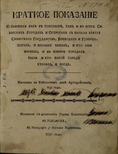 Варлаам (Петров, Василий Петрович; ок.1728-1802). Краткое показание о бывших как в Тобольске, так и во всех Сибирских городах и острогах с начала взятия Сибирского государства, воеводах и губернаторах и прочих чинах; и кто они именно, с каких городов были и кто какой город строил и когда / писанное в Тобольском доме архиерейском 1791 года ; печатано с дозволения Управы благочиния. - Тобольск : Тип. у Василья Корнильева, 1792