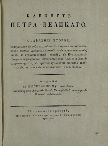 Беляев, Осип Петрович (1763-1807). Кабинет Петра Великого. Отд. 2 / издано по высочайшему повелению Имп. Акад. наук унтер-библиотекарем Осипом Беляевым. - Санкт-Петербург : Имп. тип., 1800