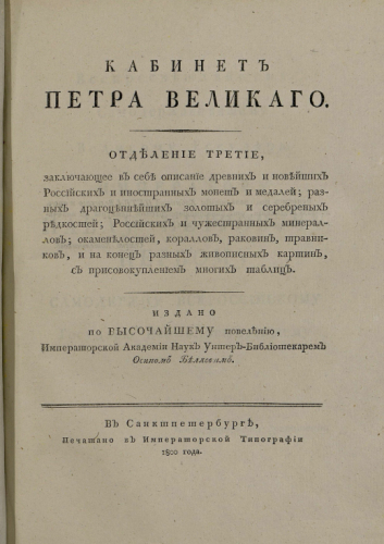 Беляев, Осип Петрович (1763-1807). Кабинет Петра Великого. Отд. 3 / издано по высочайшему повелению Имп. Акад. наук унтер-библиотекарем Осипом Беляевым. - Санкт-Петербург : Имп. тип., 1800