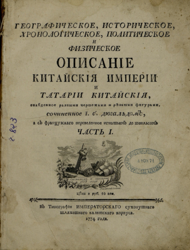 Дю Гальд, Жан Батист (1674-1743). Географическое, историческое, хронологическое, политическое и физическое описание Китайской империи и Татарии Китайской. Ч. 1. / соч. И.Б. Дюгальдом, а с фр. пер. Игнатьем де Теильсом. - [Санкт-Петербург] : В Тип. Имп. сухопутного шляхетного кадетского корпуса, 1774