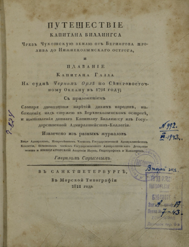 Сарычев, Гавриил Андреевич (1763-1831). Путешествие капитана Биллингса через Чукотскую землю от Берингова пролива до Нижнеколымского острога, и плавание капитана Галла на судне Черном Орле по Северо-восточному океану в 1791 г. / извлечено из разных журналов... Гаврилом Сарычевым. - Санкт-Петербург : Мор. тип., 1811