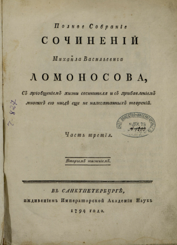 Ломоносов, Михаил Васильевич (1711-1765). Полное собрание сочинений Михаила Васильевича Ломоносова, с приобщением жизни сочинителя и с прибавлением многих его нигде не напечатанных творений. Ч. 3. - вторым тиснением. - Санкт-Петербург : иждивением Имп. Акад. наук, 1794