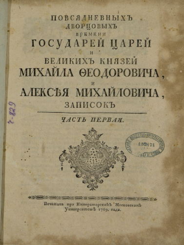 Повседневных дворцовых времени государей царей и великих князей Михайла Федоровича и Алексея Михайловича записок. Ч. 1. - Москва : При Имп. Моск. ун-те, 1769