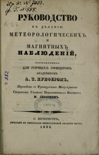 Купфер, Адольф Яковлевич (1799-1865). Руководство к деланию метеорологических и магнитных наблюдений / сост. для горных офицеров академиком А.Т. Купфером ; пер. с фр. манускрипта студентом Гл. пед. ин-та М. Спасским. - Санкт-Петербург : Тип. Имп. Акад. наук, 1835