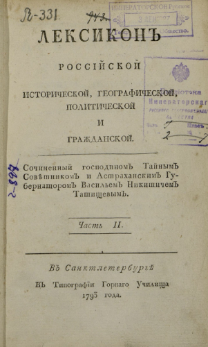 Татищев, Василий Никитич (1686-1750). Лексикон российский исторический, географический, политический и гражданский. Ч. 2 : [Г-Ж] / Сочиненный господином тайным советником и астраханским губернатором Васильем Никитичем Татищевым. - Санкт-Петербург : Тип. Горного училища, 1793