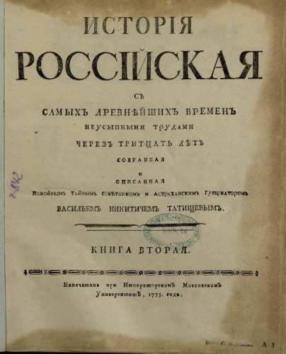 Татищев, Василий Никитич (1686-1750). История Российская с самых древнейших времен. Кн. 2. / Неусыпными трудами через тридцать лет собранная и описанная покойным тайным советником и астраханским губернатором Васильем Никитичем Татищевым. - [Москва] : Напечатана при Имп. Московском университете, 1773