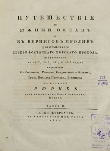 Коцебу, Отто Евстафьевич (1788-1846). Путешествие в Южный океан и в Берингов пролив для отыскания северо-восточного морского прохода, предпринятое в 1815, 1816, 1817 и 1818 годах иждивением его сиятельства, господина государственного канцлера, графа Николая Петровича Румянцева на корабле Рюрике под начальством флота лейтенанта Коцебу. Ч. 2. - Санкт-Петербург : Тип. Ник. Греча, 1821