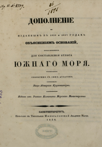 Крузенштерн, Иван Федорович (1770-1846). Дополнение к изданным в 1826 и 1827 годах объяснениям оснований, послуживших для составления Атласа Южного моря / Совокупно с сим атласом соч. вице-адм. Крузенштерн ; изд. от Учен. ком. Мор. м-ва. - Санкт-Петербург : Тип. Акад. наук, 1836