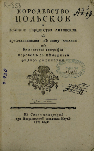 Бюшинг, Антон Фридрих (1724-1793). Королевство Польское и Великое герцогство Литовское с присоединенными к оному землями / из Бишинговой географии перевел с нем. Федор Рогенбуке. - Санкт-Петербург : При Имп. Акад. наук, 1775