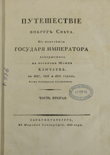 Головнин, Василий Михайлович (1776-1831). Путешествие вокруг света, по повелению государя императора, совершенное, на военном шлюпе Камчатке, в 1817, 1818 и 1819 годах, флота капитаном Головниным. Ч. 2. - Санкт-Петербург : Мор. тип., 1822