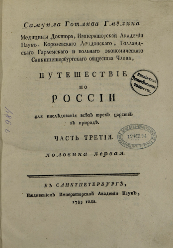 Гмелин, Самуил Готлиб (1745-1774). Путешествие по России для исследования всех трех царств в природе. Ч. 3. / Самуила Готлиба Гмелина, Мед. доктора, Имп. Акад. наук, Королевского Лондонского, Голландского Гарлемского и Вольного экономич. Санктпетерб. о-ва члена. - Санкт-Петербург : иждивением Имп. Акад. наук, 1785
