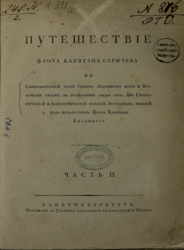 Сарычев, Гавриил Андреевич (1763-1831). Путешествие флота капитана Сарычева по северо-восточной части Сибири, Ледовитому морю и Восточному океану, в продолжение восьми лет, при географической и астрономической морской экспедиции, бывшей под начальством флота капитана Биллингса, с 1785 по 1793 год. Ч. 2. - Санкт-Петербург : В тип. Шнора, [1802]