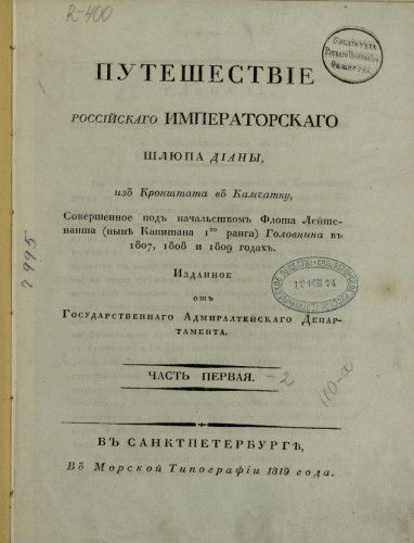 Головнин, Василий Михайлович (1776-1831). Путешествие российского императорского шлюпа Дианы из Кронштадта в Камчатку, совершенное под начальством флота лейтенанта (ныне капитана 1-го ранга) Головнина в 1807, 1808 и 1809 годах. Ч. 1. / Изданное от Гос. Адмиралтейского департамента. - Санкт-Петербург : Мор. тип., 1819