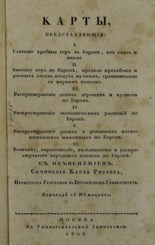 Риттер, Карл (1779-1859). Карты, представляющие: 1. Главные хребты гор в Европе, их связь и мысы. 2. Высоту гор в Европе, предел прозябений и разных слоев воздуха на оных, сравнительно с жарким поясом. 3. Распространение диких деревьев и кустов по Европе. 4. Распространение экономических растений по Европе. 5. Распространение диких и домашних млекопитающих животных по Европе. 6. Величину, народочислие, населенность и распространение народных племен по Европе : с объяснением / соч. Карла Риттера, проф. географии в Берлин. ун-те ; пер. с нем. - Москва : Унив. тип., 1828