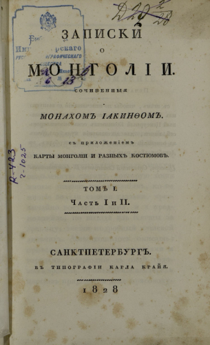 Иакинф (Бичурин, Никита Яковлевич) (1777-1853). Записки о Монголии. Т. 1. / соч. монахом Иакинфом. - Санкт-Петербург : Тип. К. Крайя, 1828