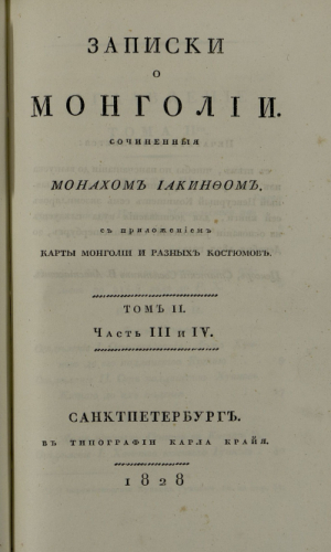 Иакинф (Бичурин, Никита Яковлевич) (1777-1853). Записки о Монголии. Т. 2. / соч. монахом Иакинфом. - Санкт-Петербург : Тип. К. Крайя, 1828