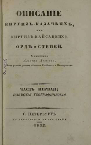 Левшин, Алексей Ираклиевич (1798-1879). Описание киргиз-казачьих или киргиз-кайсацких орд и степей. Ч. 1 : Известия географические / Соч. Алексея Левшина, чл. раз. учен. о-в России и иностр. - Санкт-Петербург : Тип. Карла Крайя, 1832
