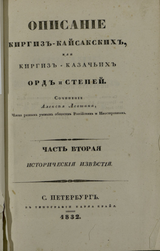 Левшин, Алексей Ираклиевич (1798-1879). Описание киргиз-кайсацких или киргиз-казачьих орд и степей. Ч. 2 : Исторические известия / Соч. Алексея Левшина, чл. раз. учен. о-в России и иностр. - Санкт-Петербург : Тип. Карла Крайя, 1832