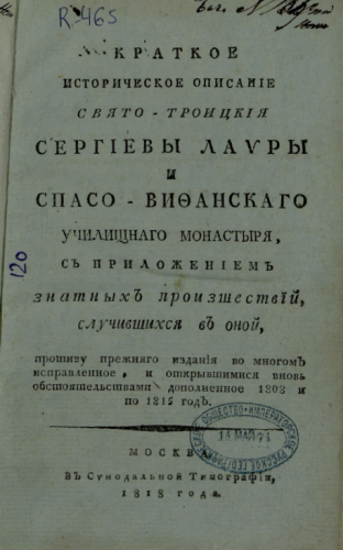 Павел (Пономарев, Петр Николаевич; 1745-1806). Краткое историческое описание Свято-Троицкой Сергиевой Лавры и Спасо-Вифанского училищного монастыря : с приложением знатных происшествий, случившихся в оной, против прежнего издания во многом исправленное, и открывшимися вновь обстоятельствами дополненное 1808 и по 1815 год. - 5-е изд. - Москва : Синодальная тип., 1818