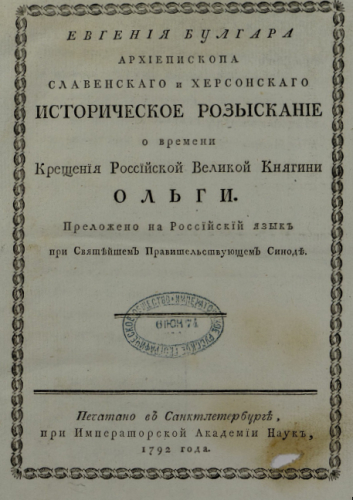 Евгений (Булгарис Елевферий; 1716-1806). Евгения Булгара архиепископа Славенского и Херсонского Историческое разыскание о времени крещения российской великой княгини Ольги / преложено на российский язык при Святейшем правительствующем синоде. - Санкт-Петербург : Печ. при Имп. Акад. наук, 1792