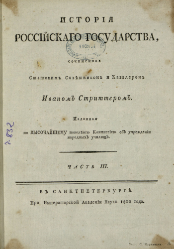 Стриттер, Иван Михайлович (1740-1801). История Российского государства. Ч. 3. / Соч. ст. сов. и кавалером Иваном Стриттером. - Санкт-Петербург : При Имп. Акад. наук, 1802