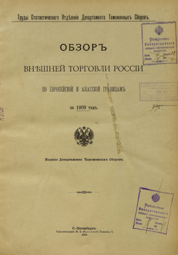 Обзор внешней торговли России по европейской и азиатской границам за 1908 год. - Санкт-Петербург : Департамент таможенных сборов, 1910