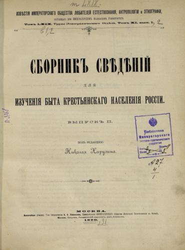 Известия Имп. Общества любителей естествознания, антропологии и этнографии. Т. 69 : Труды Этнографического отдела. Т. 11, Вып. 1 : Сборник сведений для изучения быта крестьянского населения России. Вып. 2. / под ред. Николая Харузина. - Москва, 1890