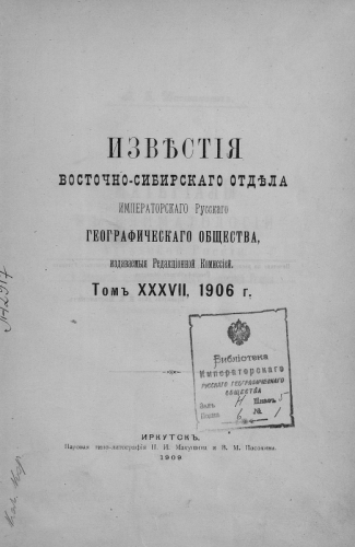 Известия Восточно-Сибирского отдела ИРГО. Т. ХХХVII : 1906 г. - Иркутск, 1909