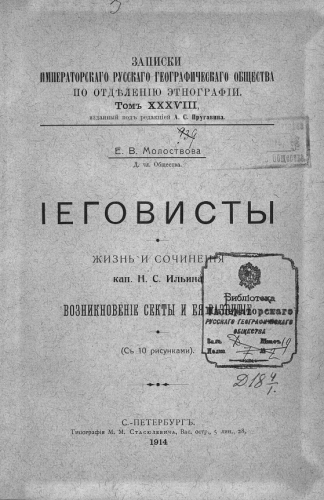 Записки ИРГО по Отделению этнографии. Т. XXXVIII : Иеговисты : жизнь и сочинения кап. Н.С. Ильина. Возникновение секты и ее развитие / Е.В. Молоствова. - СПб, 1878