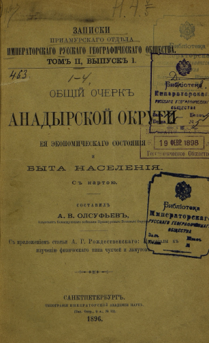 Записки Приамурского отдела ИРГО. Т. II, Вып. 1 : Общий очерк Анадырской округи, ее экономического состояния и быта населения / сост. А.В. Олсуфьев - Санкт-Петербург, 1896