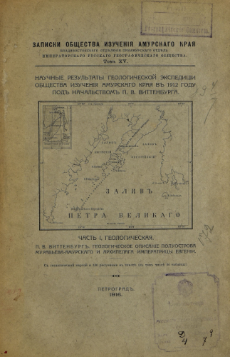 Записки Общества изучения Амурского края (Владивостокского отделения Приамурского отдела ИРГО). Т. ХV : Научные результаты Геологической экспедиции Общества изучения Амурского края в 1912 году под нач. П.В. Виттенбурга. Ч. 1 : Геологическая : Геологическое описание полуострова Муравьева-Амурского и Архипелага императрицы Евгении / П.В. Виттенбург - Петроград, 1916