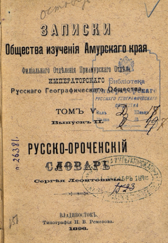 Записки Общества изучения Амурского края (Филиального отделения Приамурского отдела ИРГО). Т. V, Вып. 2 : Краткий русско-ороченский словарь с грамматической заметкой : наречие бассейна реки Тумнин, впадающей в Татарский пролив, севернее Императорской гавани / сост. Сергей Леонтович - Владивосток, 1896