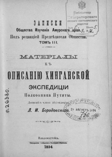 Записки Общества изучения Амурского края. Т. III : Материалы к описанию Хинганской экспедиции полковника Путяты. Дневник члена экспедиции Л.И. Бородовского - Владивосток, 1894