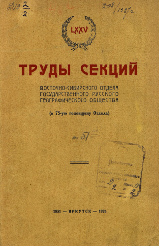 Известия Восточно-Сибирского отдела Государственного РГО. Т. LI : Труды секций ВСО РГО (в 75-ую годовщину Отдела). - Иркутск, 1926