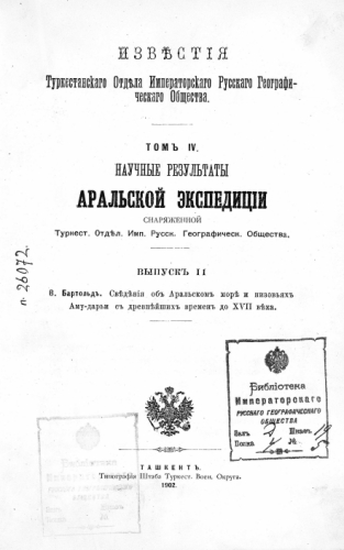 Известия Туркестанского отдела ИРГО. Т. IV : Научные результаты Аральской экспедиции. Вып. 2 : Сведения об Аральском море и низовьях Аму-Дарьи с древнейших времен до XVII века / В. Бартольд - Ташкент, 1902